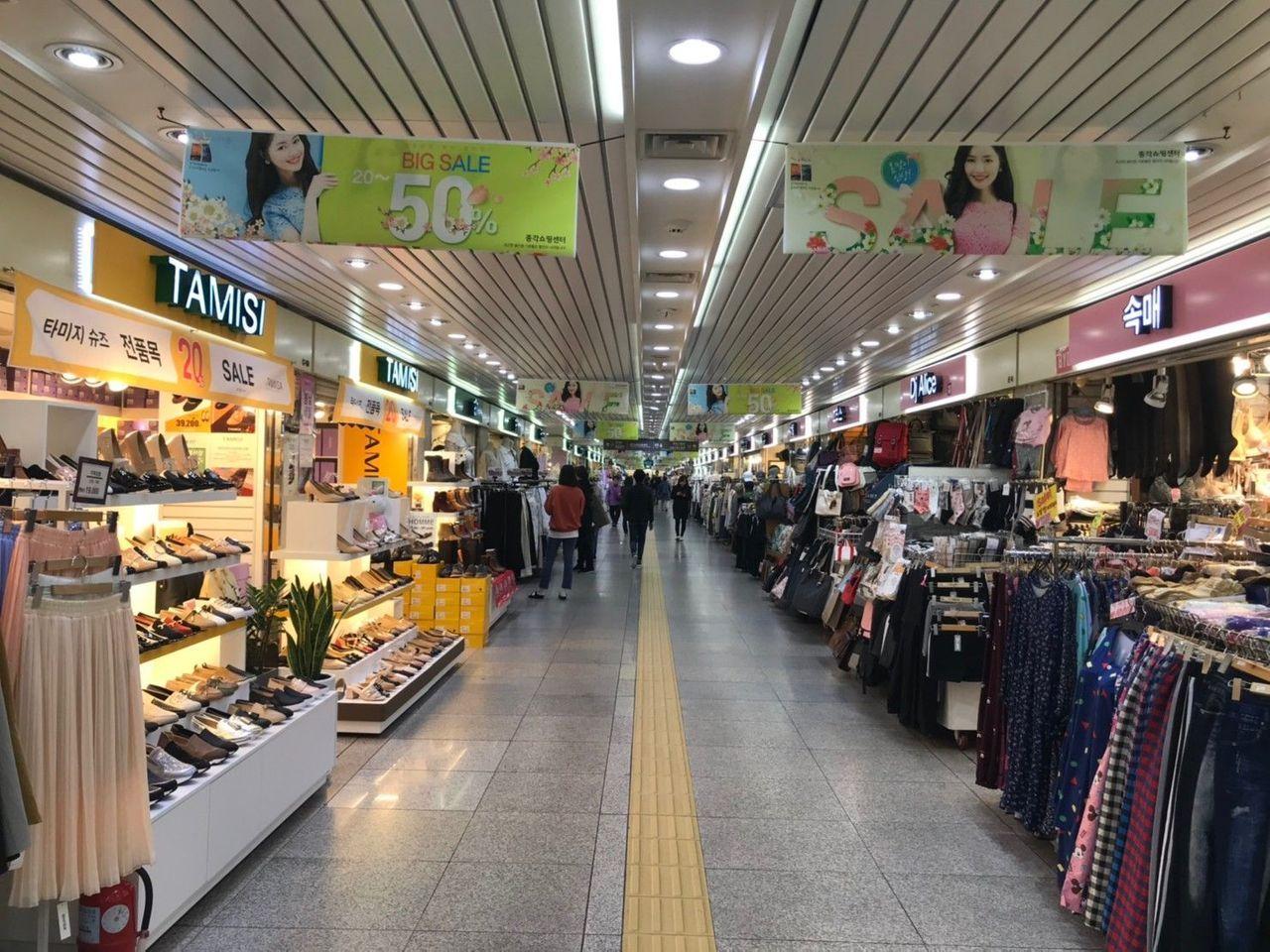 首尔有五个地下购物街,即钟阁地下购物中心、江南地下购物中心、快速公交终点地下购物中心、永登浦地下购物中心和蚕室地下购物中心。如果你去仁川的富平站,那离首尔市中心有一段距离,你会发现韩国最大的地下购物街。