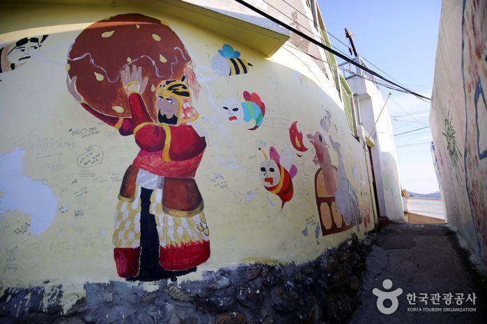 在韩国,住在山村里的住户几乎都是较为贫穷的人,根据原本统营市的发展计划,是要将东崖村撤离,改建成官方公园。当地主户为了阻止这个征收,以全韩国为目标,招募志工将这里以壁画的方式进行美化。于是,错综复杂的巷弄里,出现了许多美丽壁画,并吸引其他地方的韩国人前来旅游,成为韩国人当时的新景点之一。