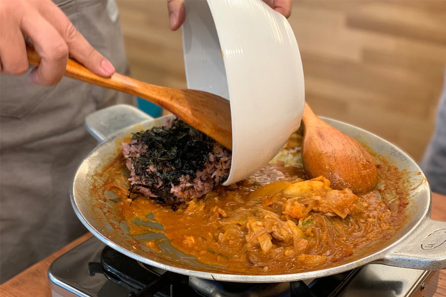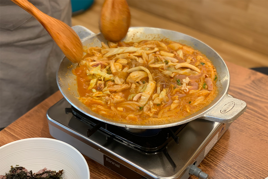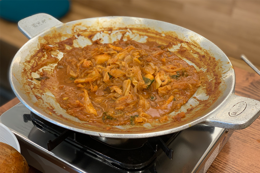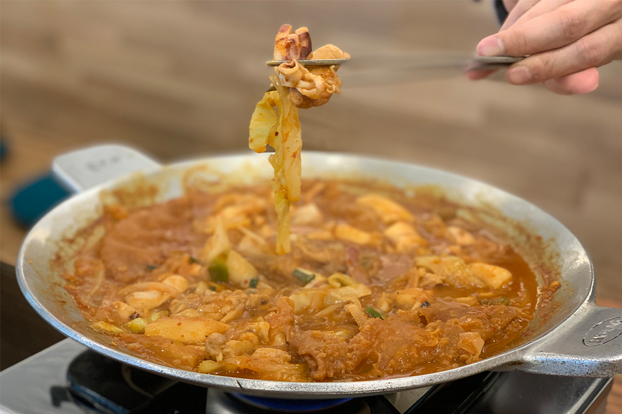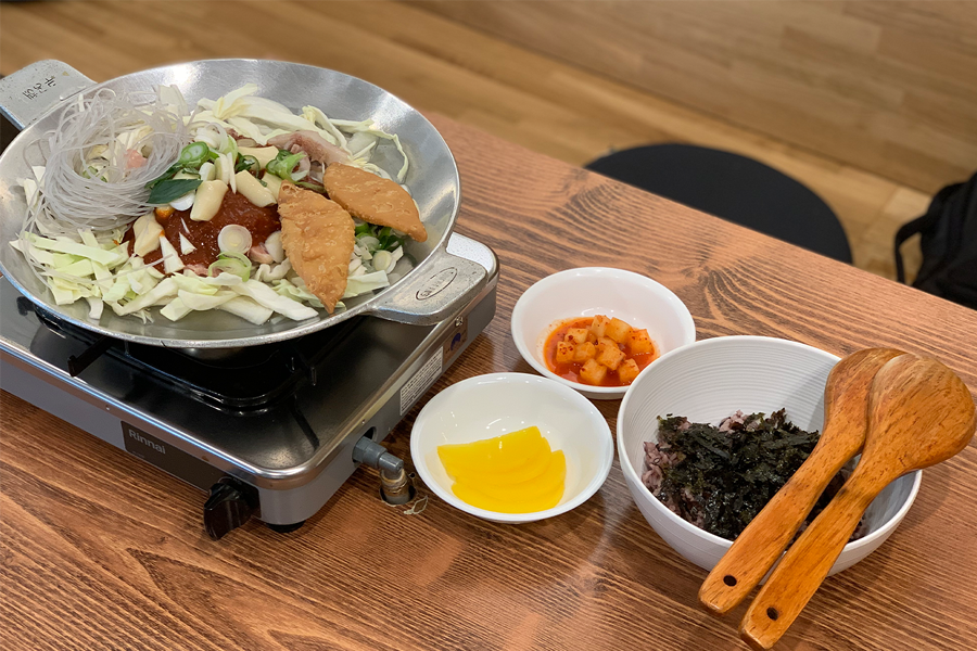 点餐方式则是按人头点餐,口味则是从辣鸡、辣猪肉、辣鱿鱼其中选择(1人份₩10,000),而餐点也都会附上蒸蛋与炒饭。