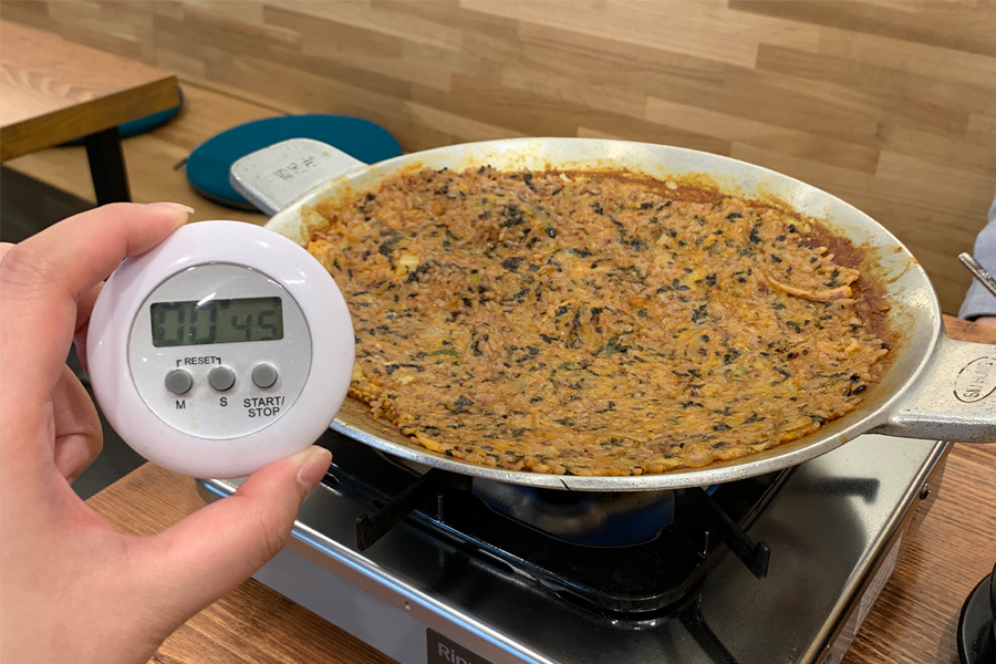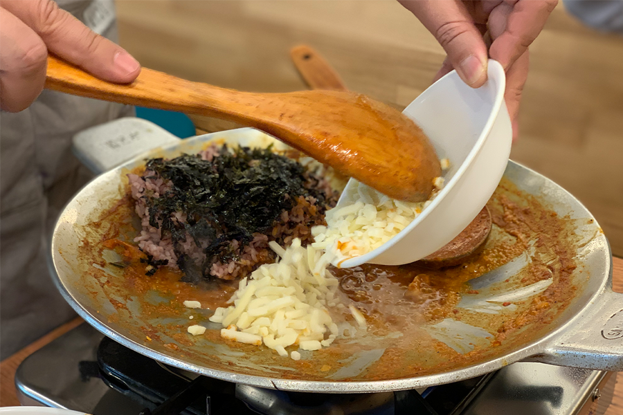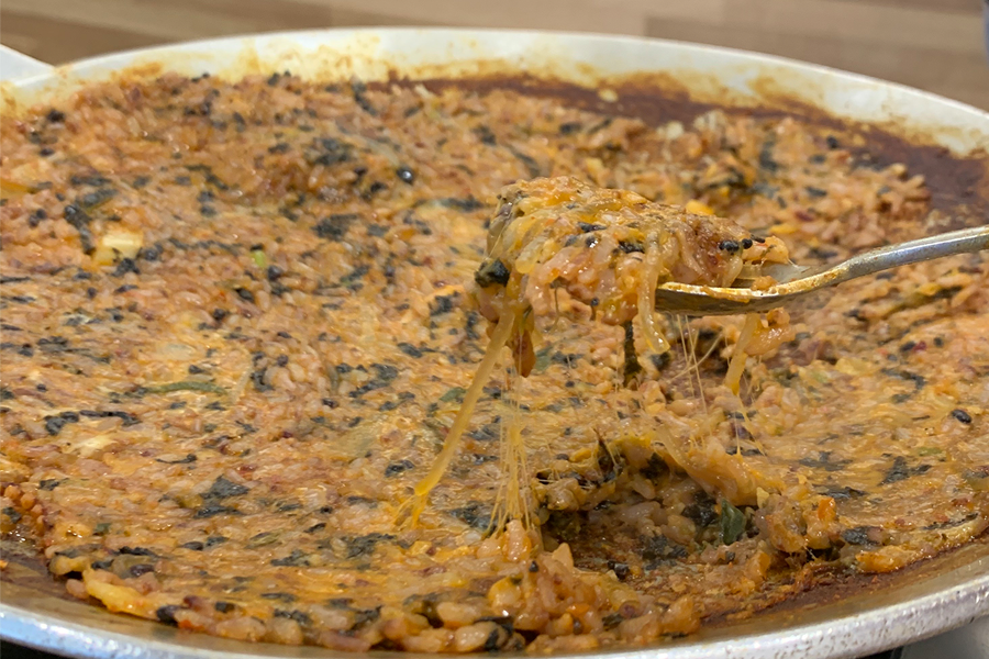 只见梨大火饭老板迅速地帮小编炒好饭,最后在锅上铺平、计时约45秒后就能品尝到美味的锅巴炒饭。火饭美味的焦香,配上融化的起司,真的太邪恶了啦。