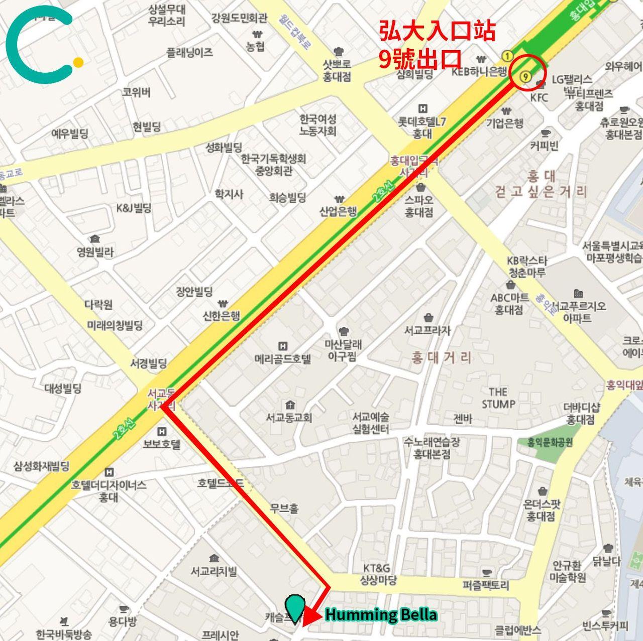 • 小撇步:从弘大入口站9号出口出来后直走,看到汉堡王后左转。继续直走后会看到右边有一间「HAHA&金钟国401精肉食堂」,从那边右转,往前直走就可以看到Humming Bella在右手边。