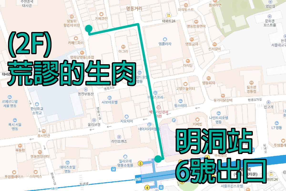 - 小撇步:首尔地铁4号线明洞站(명동역)6号出口出来左转,直走过了2个街口后,在第3个街口处左转,尽头路口处右前方看到烤肉店标示,上去2楼即会抵达(详细路线图参考文末)。