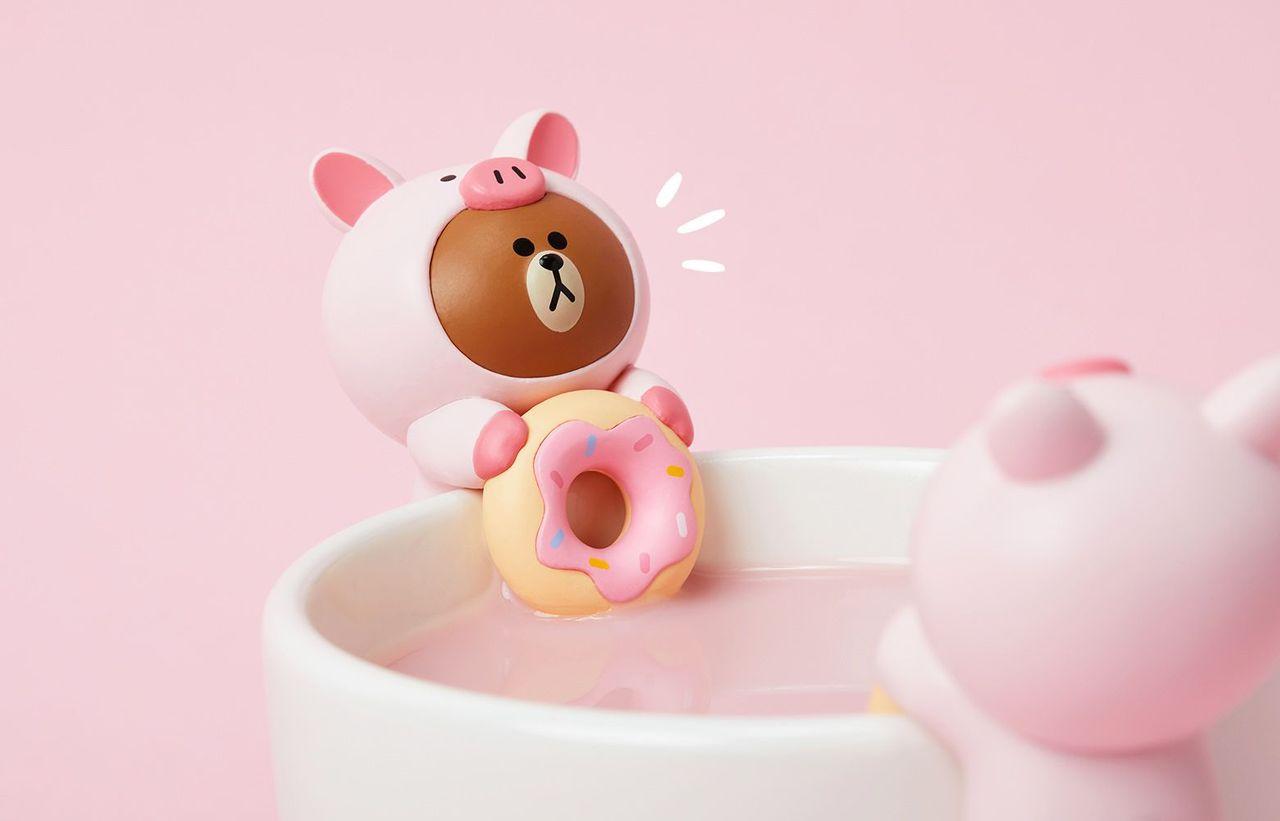 咦?这个背影是谁呢?LINE官方也有推出杯缘子,一系列共四款,也都是变装的熊大挂在杯缘,痴痴地看着你,是不是想到就心动了呢?
