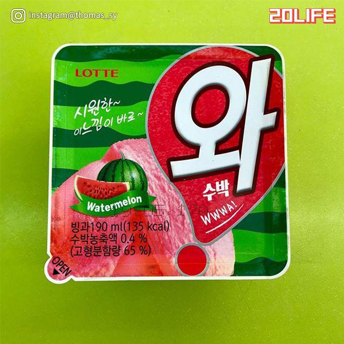 这不是西瓜饮品,而是西瓜冰品!wow是韩国乐天公司所推出的冰淇淋,常驻的口味有香草,季节限定的特别口味如芒果、橘子、哈密瓜等,也非常受欢迎。