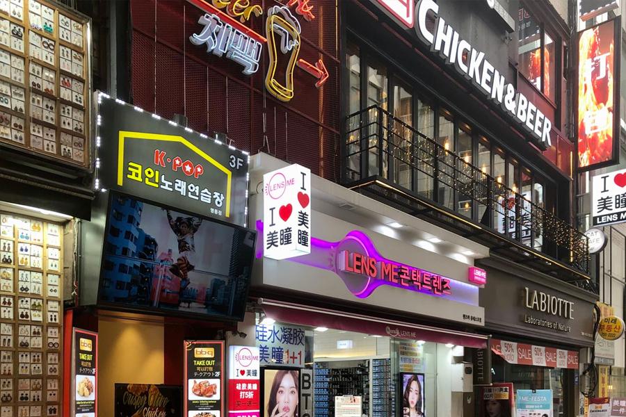 BBQ明洞Start店位于二楼,只要找到LENS ME,往上看就会找到了。BBQ内不只是卖炸鸡,还有卖许多口味的新奇炸鸡、啤酒等等,也可以内用。