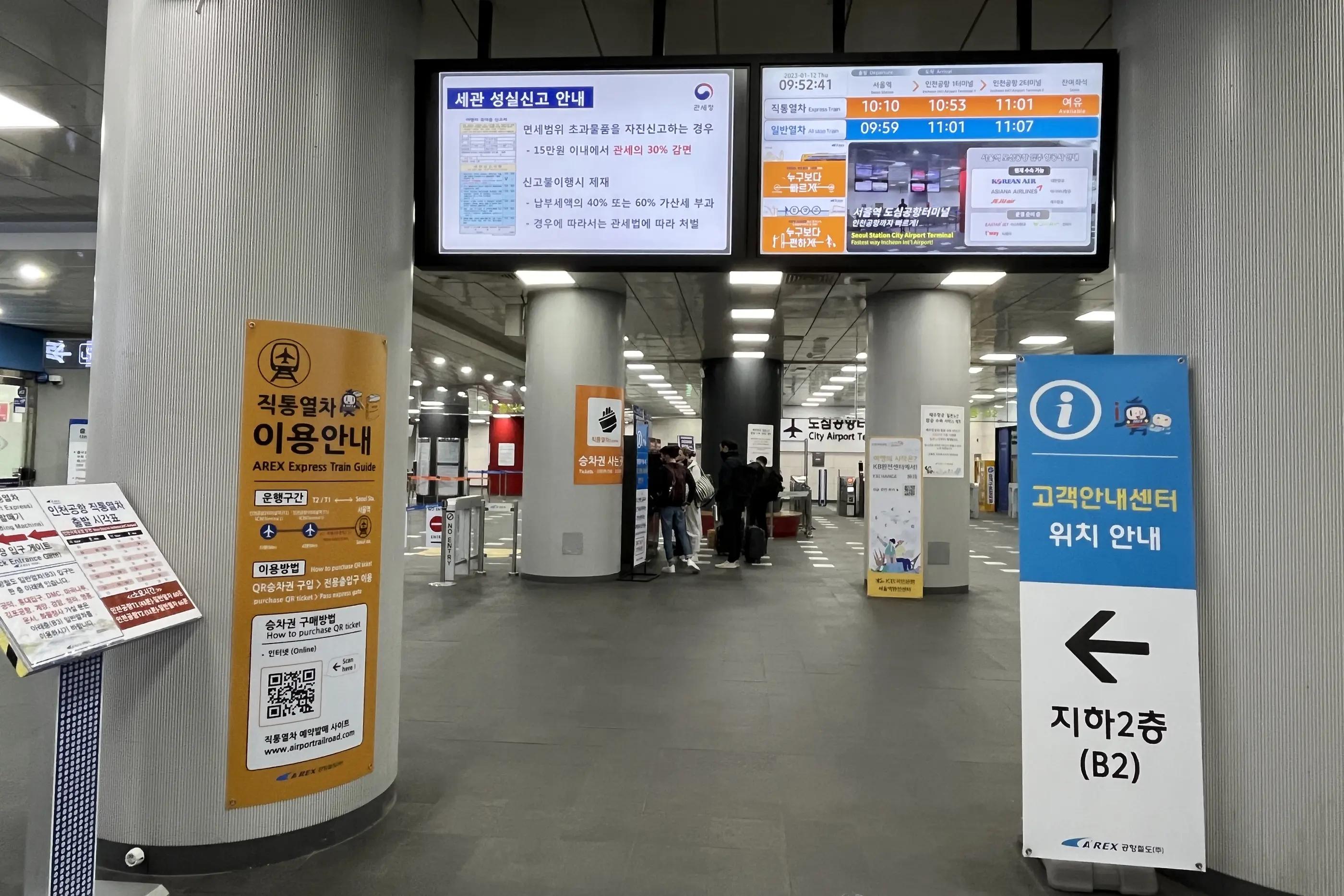 ソウル駅は非常に広く、空港鉄道(AREX)の乗り場へ向かう際、他の地下鉄路線やKTXの乗り換え通路と重なることがありますが、「Airport」や「仁川国際空港」と書かれた表示を確認しながら進むとわかりやすいです。