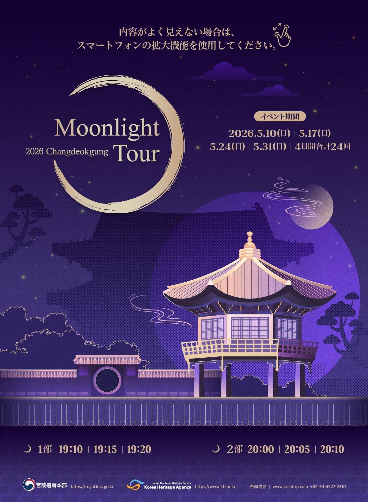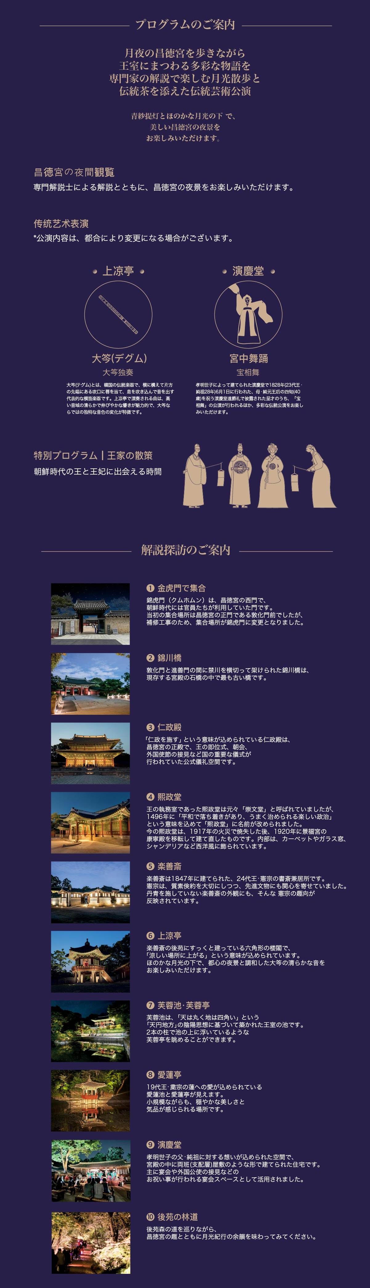 専門ガイドの解説とともに、夜の昌徳宮を巡る特別な体験プログラムです。世界文化遺産に登録された昌徳宮を歩きながら、ライトアップされた殿閣を鑑賞。上涼亭では、伝統楽器・大琴(テグム)の生演奏を楽しめます。