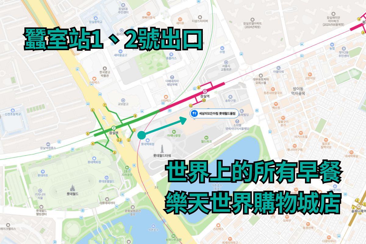 • 小撇步:首爾地鐵2號線蠶室站(잠실역)往1、2號出口走,進入1、2號出口右手邊的樂天世界購物城,上6樓後左轉即可抵達世界上的所有早餐(詳細路線圖參考文末)。