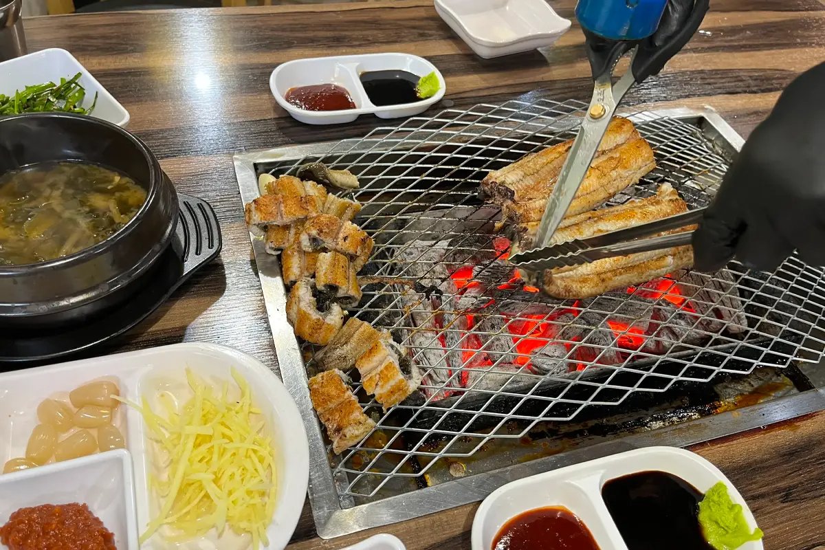 点好餐后,店家就马上端上现杀好的鳗鱼上桌,新鲜的鳗鱼心脏还在跳动。店家采用一次性烤网,确保不沾黏与卫生,全程店员都会亲切地帮忙烤,俐落的手法,让鳗鱼看起来更加可口。
