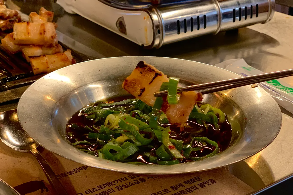 金猪食堂的五花肉烤的相当酥脆、Q弹的猪皮在嘴里化开来,沾上店家用独家配方制成的大葱酱汁,口感酸酸甜甜,让猪肉吃起来不油腻。